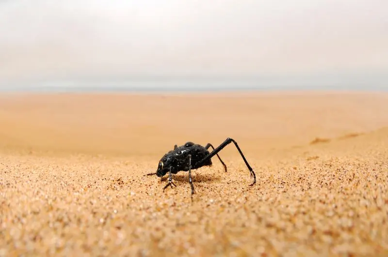 Despite the hostile environment, plants and animals have also settled here that have adapted to the unique conditions in a very special way, such as the fog-basking beetle. The beetle, about two centimeters in size, is coloured black and has strikingly long legs. These create a large distance between the torso and the hot sand. The elytra have small knobs and a groove in the middle. It obtains the water it needs for life from clouds of mist that drift across the desert.