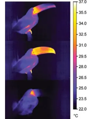 The large beaks of colourful toucans help the bird to regulate its body temperature and quickly dissipate excess heat. Therefore, the beak of the South American bird has a similar function to the ears of an elephant. Depending on the ambient temperature and physical activity, the animals can regulate the temperature via the beak in minutes.